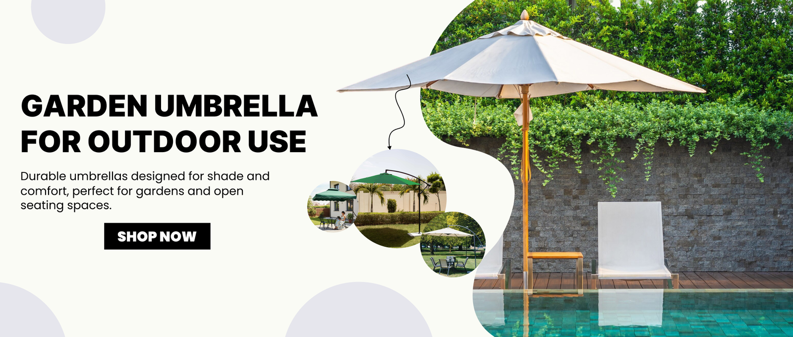 Stylish umbrellas that provide good shade for outdoor seating areas. Suitable for lawns, poolside, cafes, and patios.